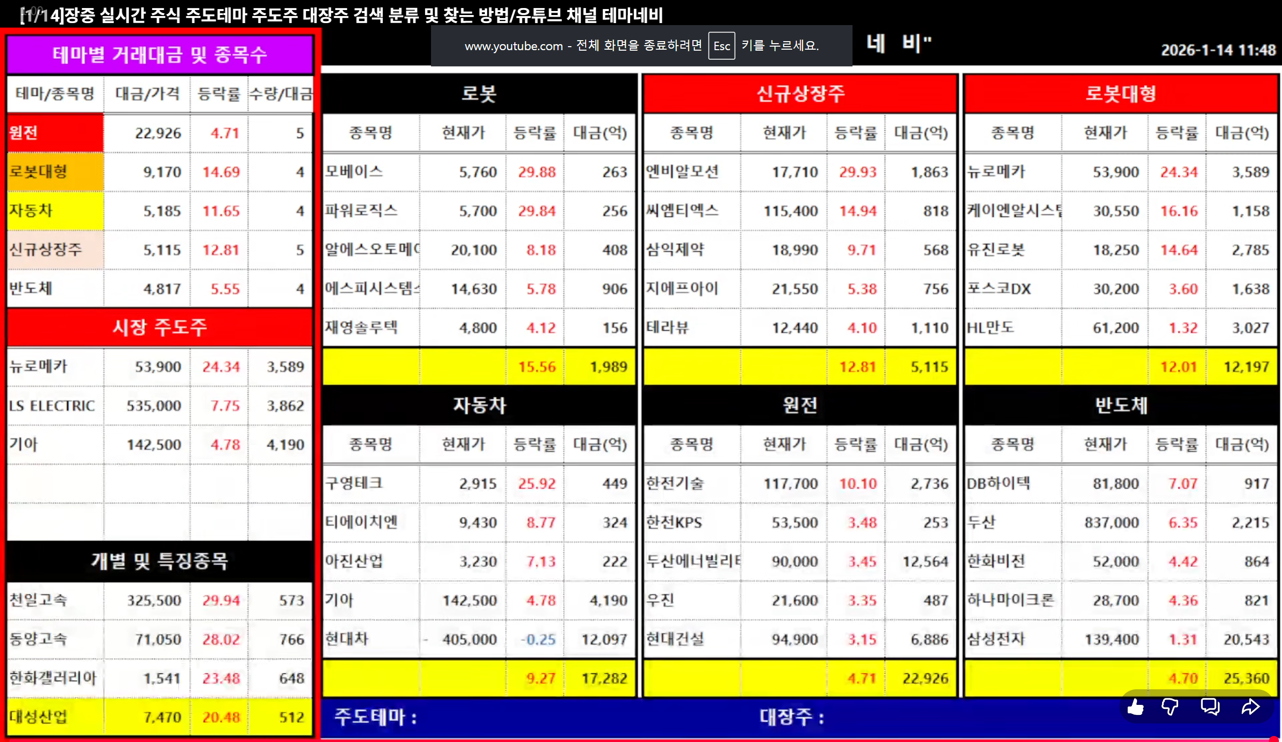 📉2026.1.14(수요일) 종목정리(테마네비) - 유투브