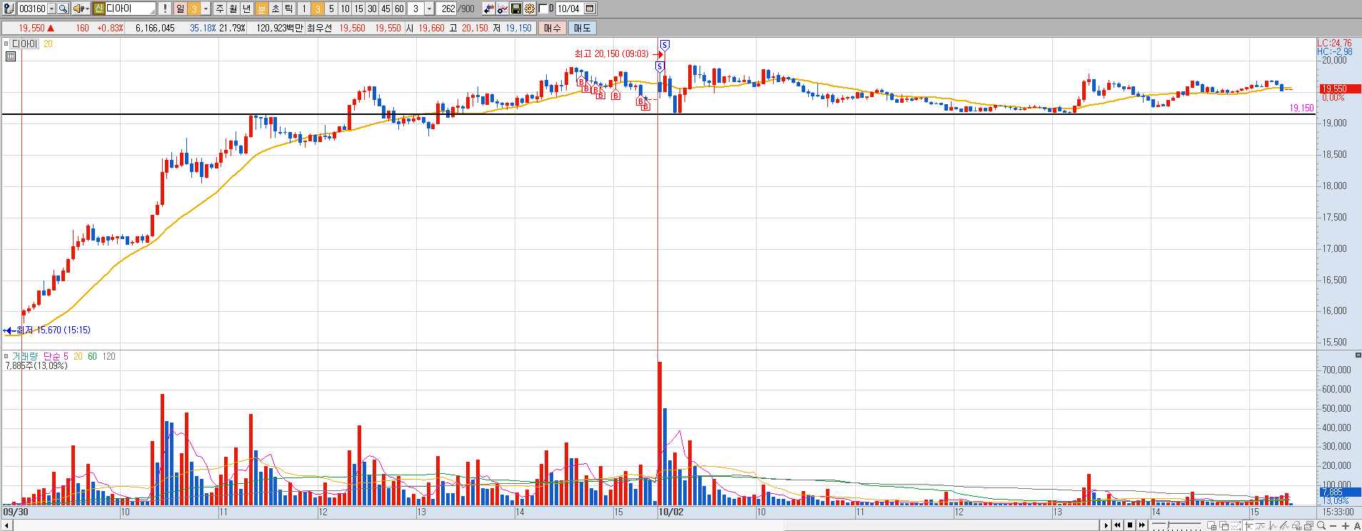 10월2일 50%정도 매도하고 연휴로 들어왔다.(당일 최저가 19,550원) 안깨지고 잘 지키고 장 끝났다.