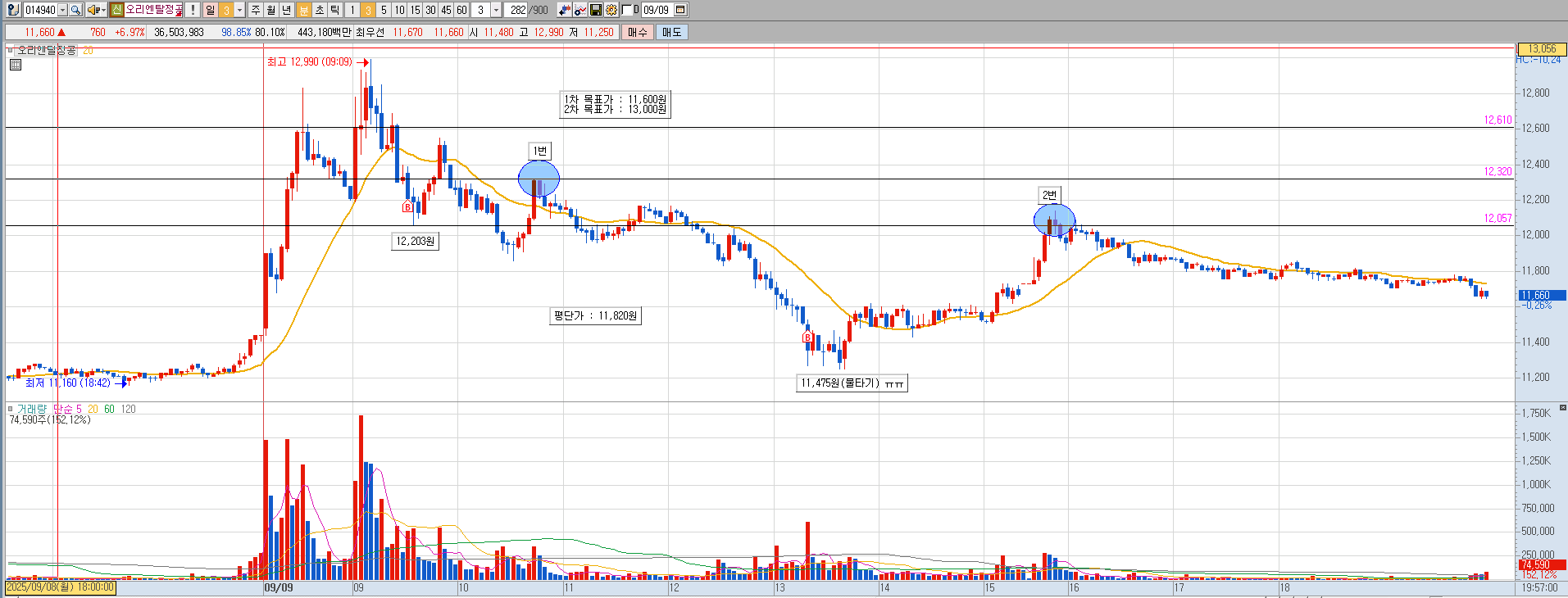 2차 목표가 13,000원 예상으로 1번지점에서 팔지 않고 기다림