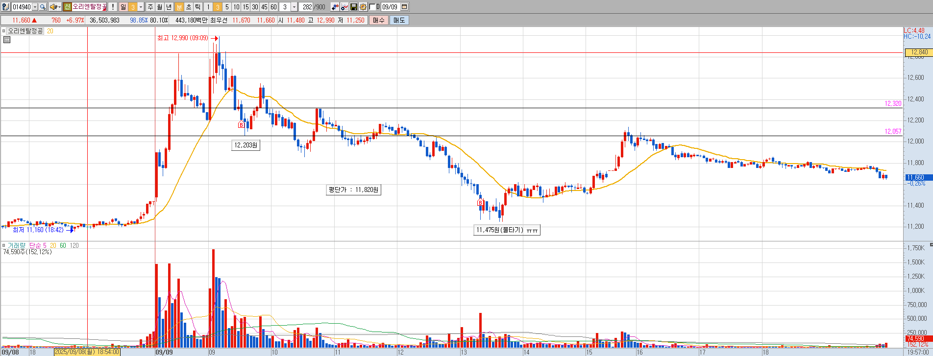 눌림에 매수후 12,203원에 진입함.