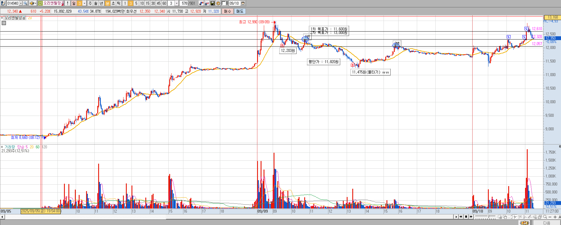 2차 목표가 안오고 12,920원까지 오른뒤 하강 하는중.