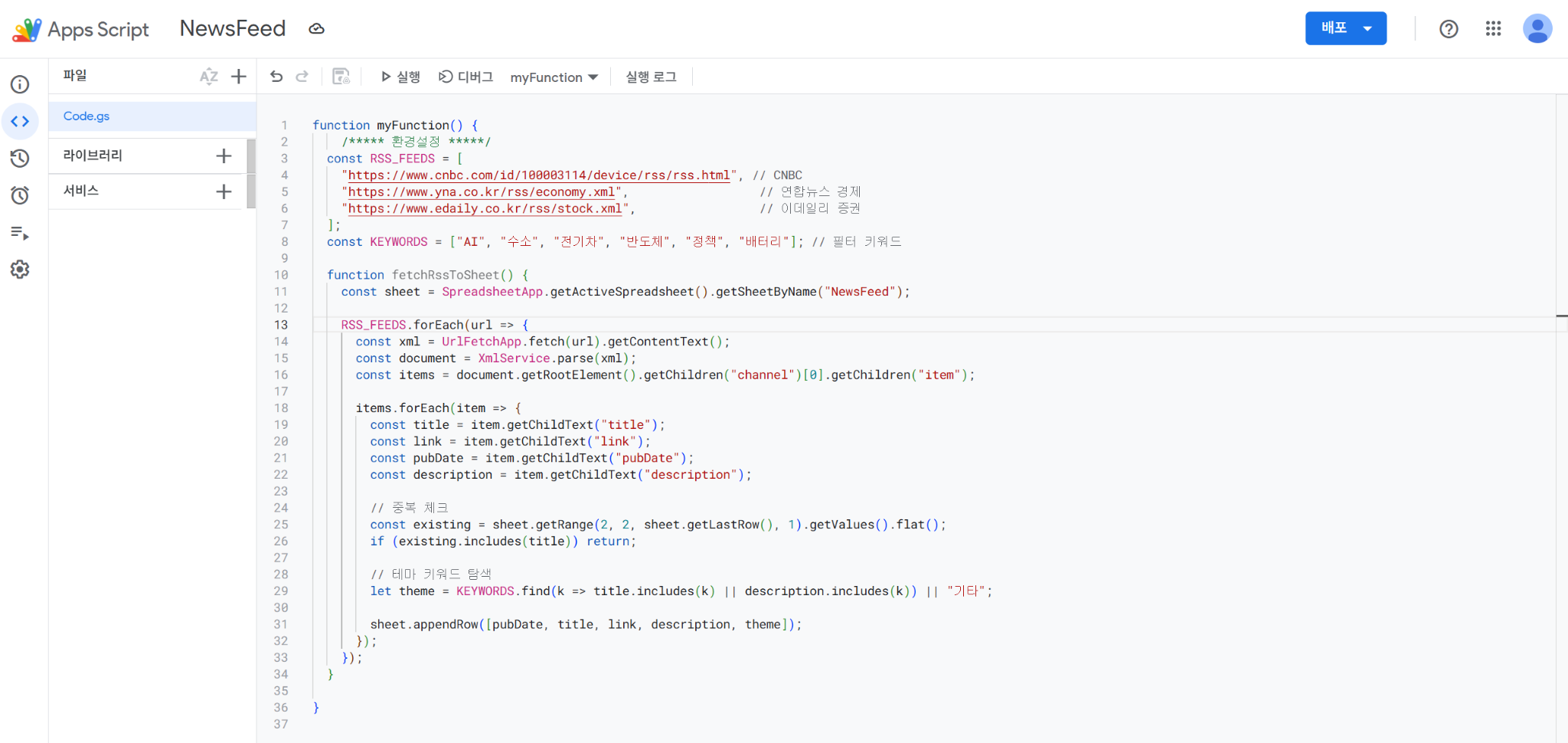 → 뉴스의 제목+설명에 키워드가 있는지 순서대로 탐색해 테마 반환. - fetchRssToSheet()